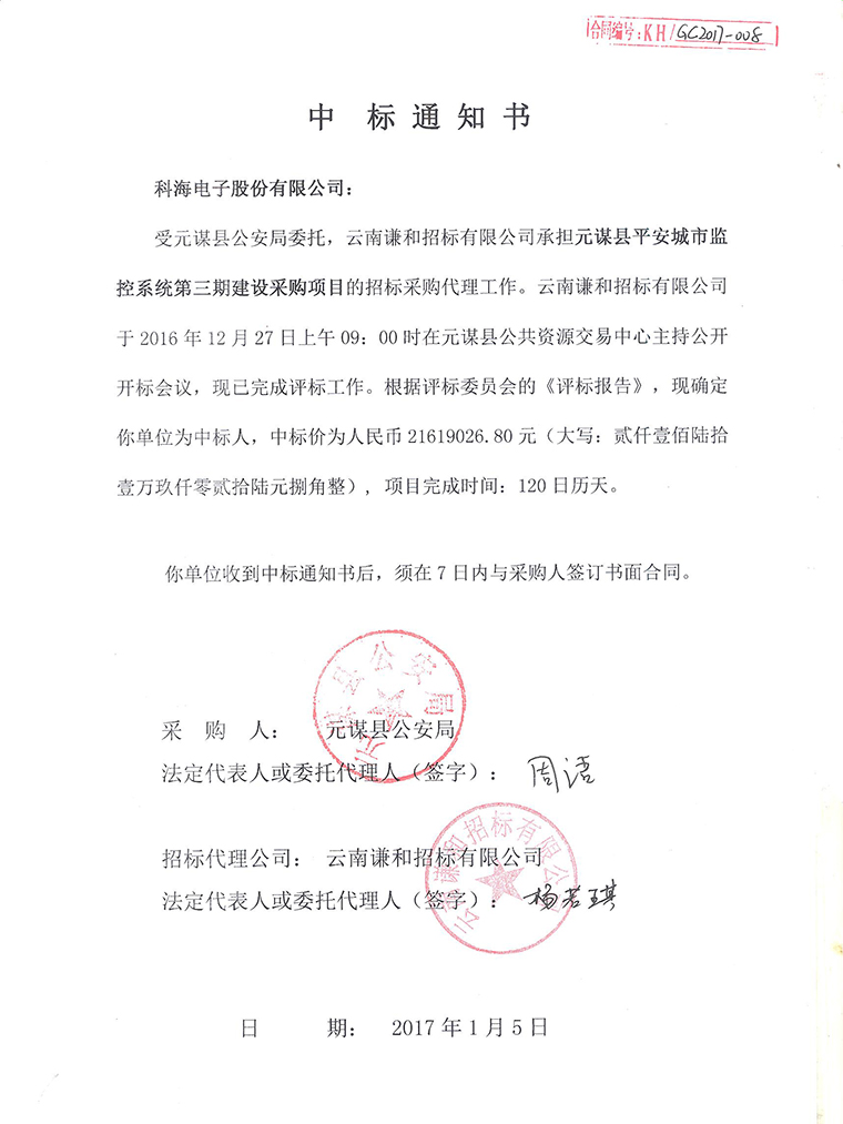 正值寒冬季節(jié),美麗的昆明依然陽光普照、溫暖如春,我公司也如同這燦爛的天氣一般,在年末收官之際頻獲喜訊W鵒鋇鍬嫉繾庸煞縈邢薰駒俅紋窘枳判酆竦募際趿α亢土己玫男龐于2016年12月28日順利中標“元謀縣平安城市控系統(tǒng)第三期建設采購項目”,中標金額:21619026.80元。