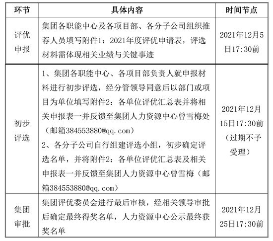 為弘揚公司企業文化,認真落實公司"勤勉誠信、務實創 新、精益高效、共存共贏"的價值觀,表彰為集團發展做出杰出 貢獻的優秀團體與個人,激發員工榮譽感與向上的動力,表彰先進,樹立榜樣,集團決定開展 2021 年度評優工作,現將有關事項通知如下: