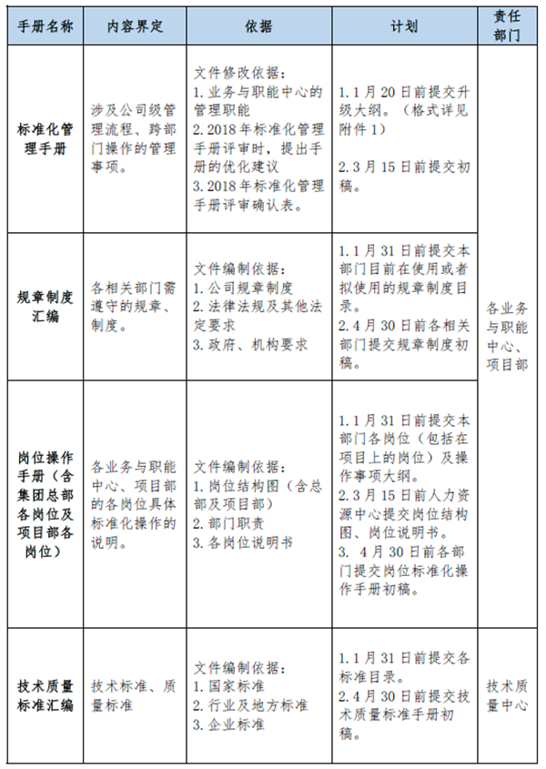 為確保標準化文件滿足公司戰略目標和經營管理目 標的要求,實現立制度、定標準、劃責權、降成本、增效 益的管理宗旨。經公司領導同意,2019 年將對公司制度體系按如下框架進行建設: