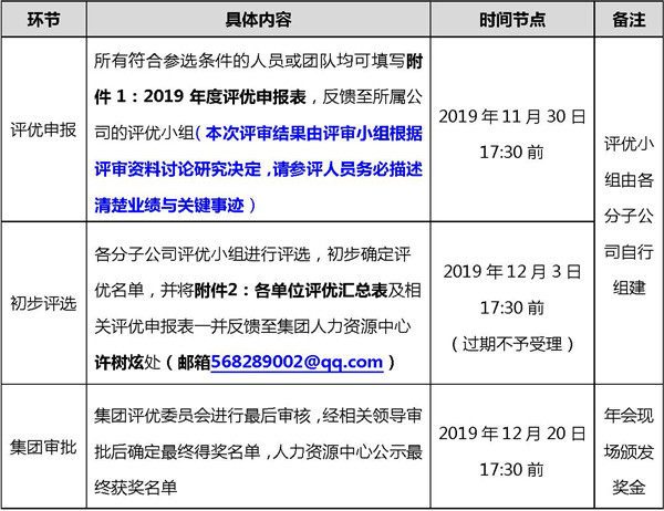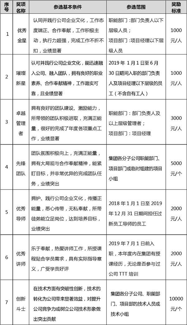 為弘揚公司企業文化,認真落實公司"勤勉誠信、務實創新、精益高效、共存共贏"的價值觀, 表彰為集團發展做出杰出貢獻的優秀團體與個人,激發員工榮譽感與向上的動力,表彰先進,樹立榜樣,集團決定開展 2019 年度評優工作,現將有關事項通知如下: