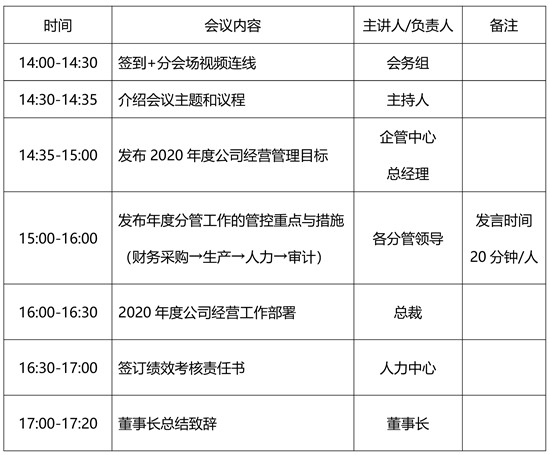 1) 各分管領導針對公司正式發布的年度經營目標,組織各自所分管的部門完成年度工作計劃與措施的完善和溝通確認工作。