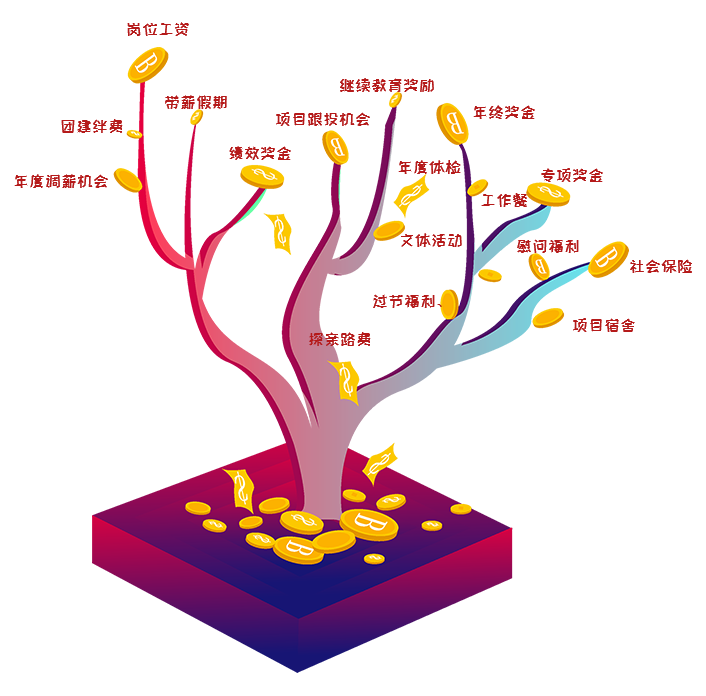 為價值、為貢獻付薪以崗位價值、個人能力與業績貢獻為基礎的薪酬管理體系;崗位工資、績效獎金、年終獎金、專項獎金、年度調薪機會、項目跟投機會等等;