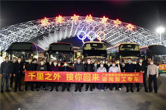 2月26日,建星集團正式開通建筑工人“點對點”一站式返崗復工專車服務,已順利完成湖南專線并接回返珠工人近百名。2月29日晚上20:30,第二批四川、重慶專線共9輛車也順利抵珠,歷時27個小時,跨越1800公里,接回約200名工人,送抵各項目部。