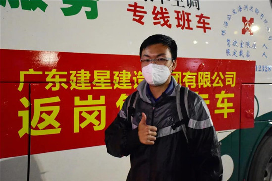 “在家里待了一個多月,好想回來上班,一直買不到票我都著急死了。沒想到建星不僅安排免費的專車把我們安全送到,一路上還有小伙伴幫我們搬行李、送食物,真的好感動!給你們點贊!”