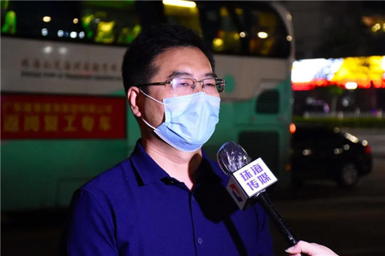 當晚,珠海市住建局局長方小勇帶隊在體育中心集中點等候迎接返崗工人。車輛抵達后,方局第一時間了解路上的行車情況、對務工人員返崗表示歡迎、感謝他們為珠海的城市建設做出貢獻,并叮囑大家一定要做好防疫措施,保護自己、保護身邊人,共克時艱、迎接春暖花開。