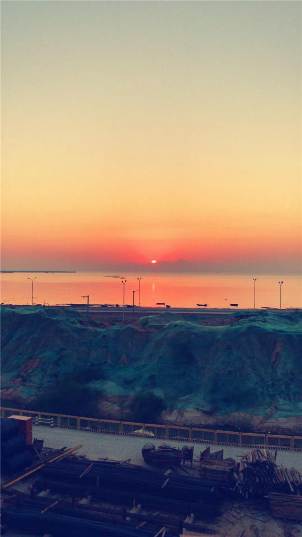 某次值班,天氣依然很熱,干完活已近黎明。身后高樓大廈,腳下鋼筋水泥,抬眼望去一輪火紅的太陽從海平面冉冉升起,真的好美。如果是有藝術細胞的人,可能會寫首詩,我完全沒有。只是感覺很幸福,并用手機記錄下了這份美好。